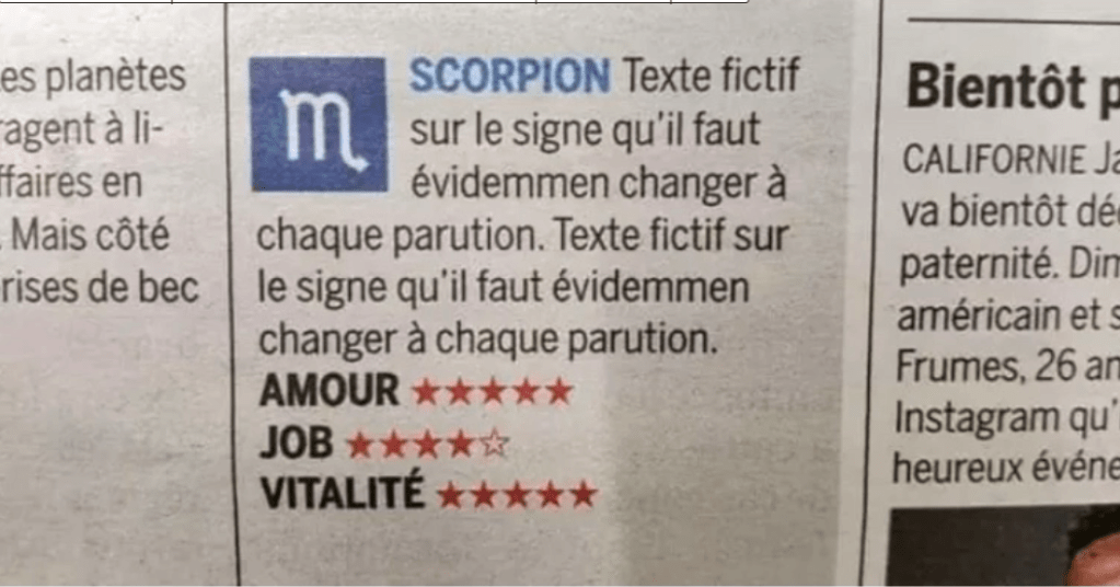 3. Les horoscopes rédigés par les stagiaires avec du texte au pif.